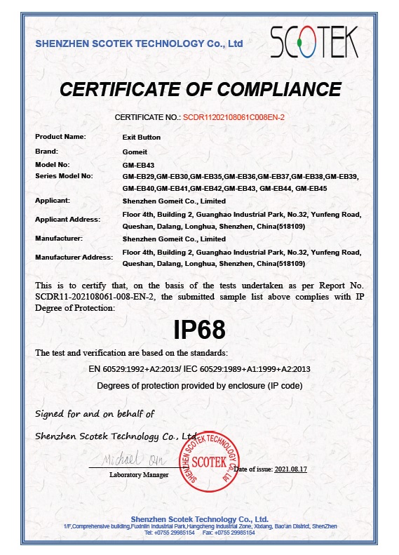 出门开关防水IP68证书